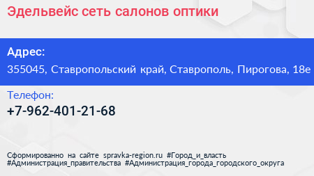 Эдельвейс, сеть салонов оптики по адресу 355045, Ставропольский край, Ставрополь, Пирогова, 18е в дальнейшем Организация, размещена в следующих категориях: