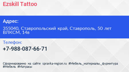 Ezskill Tattoo по адресу 355040, Ставропольский край, Ставрополь, 50 лет ВЛКСМ, 14в в дальнейшем Организация, размещена в следующих категориях: