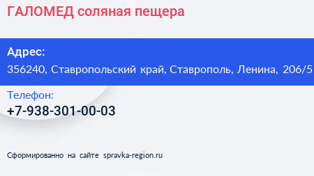 ГАЛОМЕД, соляная пещера по адресу 356240, Ставропольский край, Ставрополь, Ленина, 206/5 в дальнейшем Организация, размещена в следующих категориях: