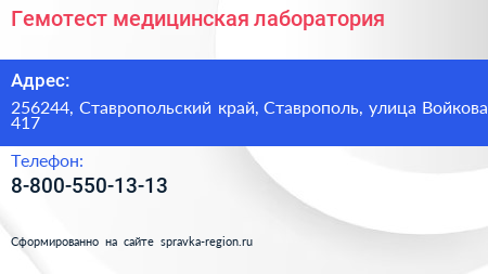 Гемотест, медицинская лаборатория по адресу 256244, Ставропольский край, Ставрополь, улица Войкова, 417 в дальнейшем Организация, размещена в следующих категориях: