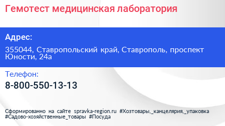 Гемотест, медицинская лаборатория по адресу 355044, Ставропольский край, Ставрополь, проспект Юности, 24а в дальнейшем Организация, размещена в следующих категориях:
