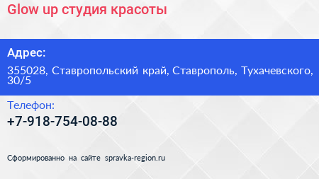 Glow up, студия красоты по адресу 355028, Ставропольский край, Ставрополь, Тухачевского, 30/5 в дальнейшем Организация, размещена в следующих категориях: