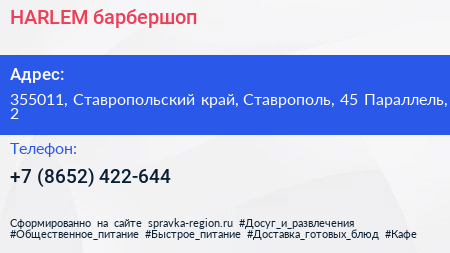 HARLEM, барбершоп по адресу 355011, Ставропольский край, Ставрополь, 45 Параллель, 2 в дальнейшем Организация, размещена в следующих категориях: