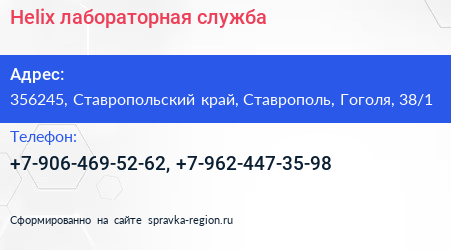 Helix, лабораторная служба по адресу 356245, Ставропольский край, Ставрополь, Гоголя, 38/1 в дальнейшем Организация, размещена в следующих категориях: