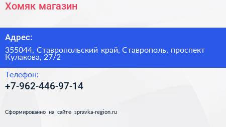 Хомяк, магазин по адресу 355044, Ставропольский край, Ставрополь, проспект Кулакова, 27/2 в дальнейшем Организация, размещена в следующих категориях: