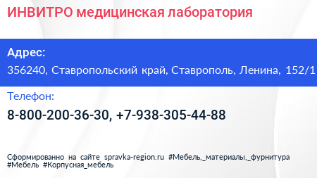 ИНВИТРО, медицинская лаборатория по адресу 356240, Ставропольский край, Ставрополь, Ленина, 152/1 в дальнейшем Организация, размещена в следующих категориях: