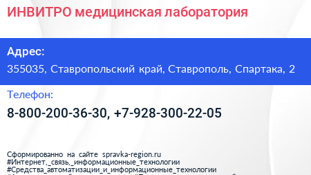 ИНВИТРО, медицинская лаборатория по адресу 355035, Ставропольский край, Ставрополь, Спартака, 2 в дальнейшем Организация, размещена в следующих категориях: