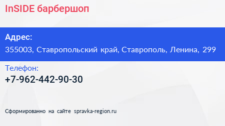 InSIDE, барбершоп по адресу 355003, Ставропольский край, Ставрополь, Ленина, 299 в дальнейшем Организация, размещена в следующих категориях: