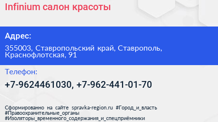 Infinium, салон красоты по адресу 355003, Ставропольский край, Ставрополь, Краснофлотская, 91 в дальнейшем Организация, размещена в следующих категориях: