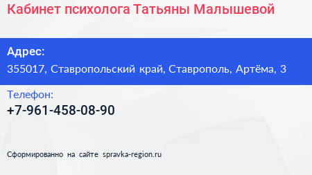 Кабинет психолога Татьяны Малышевой по адресу 355017, Ставропольский край, Ставрополь, Артёма, 3 в дальнейшем Организация, размещена в следующих категориях: