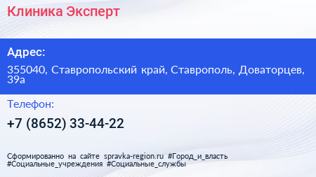 Клиника Эксперт по адресу 355040, Ставропольский край, Ставрополь, Доваторцев, 39а в дальнейшем Организация, размещена в следующих категориях: