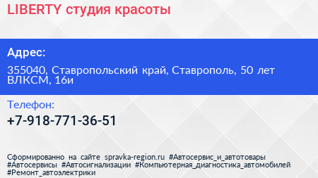 LIBERTY, студия красоты по адресу 355040, Ставропольский край, Ставрополь, 50 лет ВЛКСМ, 16и в дальнейшем Организация, размещена в следующих категориях: