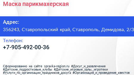 Маска, парикмахерская по адресу 356243, Ставропольский край, Ставрополь, Демидова, 2/3 в дальнейшем Организация, размещена в следующих категориях: