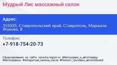 Мудрый Лис, массажный салон по адресу 355035, Ставропольский край, Ставрополь, Маршала Жукова, 8 в дальнейшем Организация, размещена в следующих категориях: