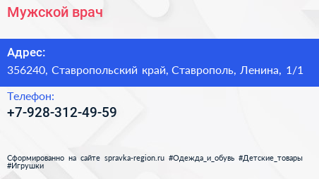 Мужской врач по адресу 356240, Ставропольский край, Ставрополь, Ленина, 1/1 в дальнейшем Организация, размещена в следующих категориях: