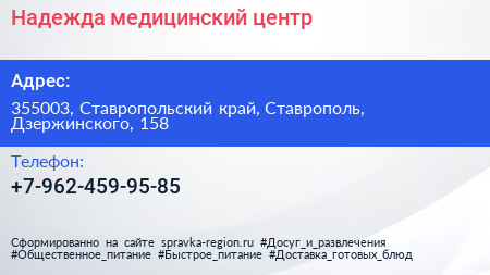 Надежда, медицинский центр по адресу 355003, Ставропольский край, Ставрополь, Дзержинского, 158 в дальнейшем Организация, размещена в следующих категориях: