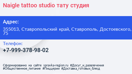 Naigle tattoo studio, тату-студия по адресу 355013, Ставропольский край, Ставрополь, Достоевского, 75 в дальнейшем Организация, размещена в следующих категориях: