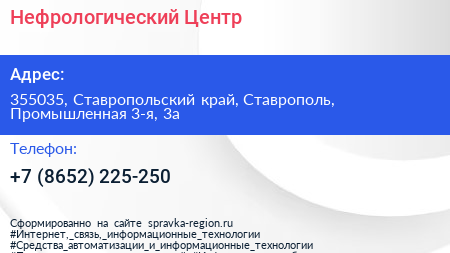 Нефрологический Центр по адресу 355035, Ставропольский край, Ставрополь, Промышленная 3-я, 3а в дальнейшем Организация, размещена в следующих категориях: