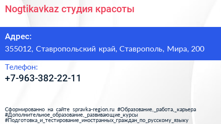 Nogtikavkaz, студия красоты по адресу 355012, Ставропольский край, Ставрополь, Мира, 200 в дальнейшем Организация, размещена в следующих категориях: