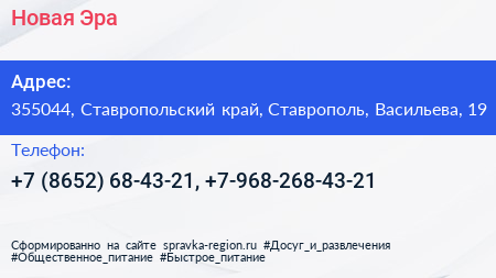 Новая Эра по адресу 355044, Ставропольский край, Ставрополь, Васильева, 19 в дальнейшем Организация, размещена в следующих категориях: