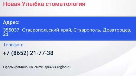 Новая Улыбка, стоматология по адресу 355037, Ставропольский край, Ставрополь, Доваторцев, 21 в дальнейшем Организация, размещена в следующих категориях: