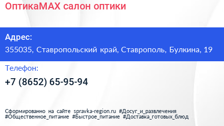 ОптикаMAX, салон оптики по адресу 355035, Ставропольский край, Ставрополь, Булкина, 19 в дальнейшем Организация, размещена в следующих категориях: