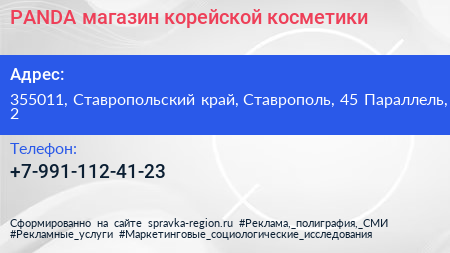 PANDA, магазин корейской косметики по адресу 355011, Ставропольский край, Ставрополь, 45 Параллель, 2 в дальнейшем Организация, размещена в следующих категориях: