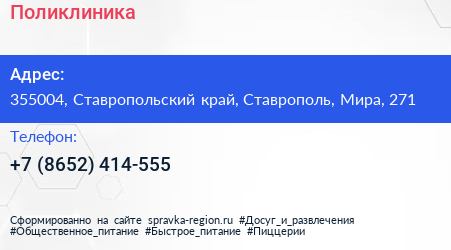 Поликлиника по адресу 355004, Ставропольский край, Ставрополь, Мира, 271 в дальнейшем Организация, размещена в следующих категориях: