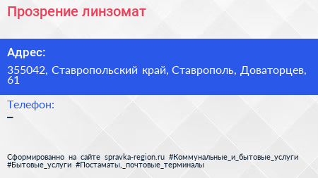 Прозрение, линзомат по адресу 355042, Ставропольский край, Ставрополь, Доваторцев, 61 в дальнейшем Организация, размещена в следующих категориях: