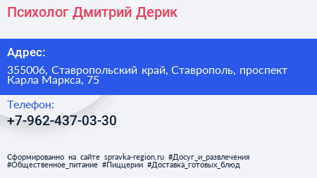 Психолог Дмитрий Дерик по адресу 355006, Ставропольский край, Ставрополь, проспект Карла Маркса, 75 в дальнейшем Организация, размещена в следующих категориях: