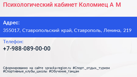 Психологический кабинет Коломиец А.М. по адресу 355017, Ставропольский край, Ставрополь, Ленина, 219 в дальнейшем Организация, размещена в следующих категориях:
