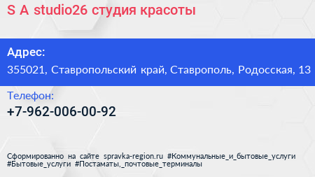 S.A studio26, студия красоты по адресу 355021, Ставропольский край, Ставрополь, Родосская, 13 в дальнейшем Организация, размещена в следующих категориях: