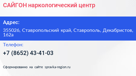 САЙГОН, наркологический центр по адресу 355026, Ставропольский край, Ставрополь, Декабристов, 162а в дальнейшем Организация, размещена в следующих категориях: