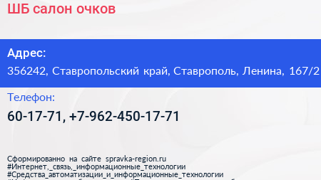 ШБ, салон очков по адресу 356242, Ставропольский край, Ставрополь, Ленина, 167/2 в дальнейшем Организация, размещена в следующих категориях: