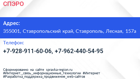 СПЭРО по адресу 355001, Ставропольский край, Ставрополь, Лесная, 157а в дальнейшем Организация, размещена в следующих категориях: