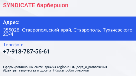 SYNDICATE, барбершоп по адресу 355028, Ставропольский край, Ставрополь, Тухачевского, 20/4 в дальнейшем Организация, размещена в следующих категориях: