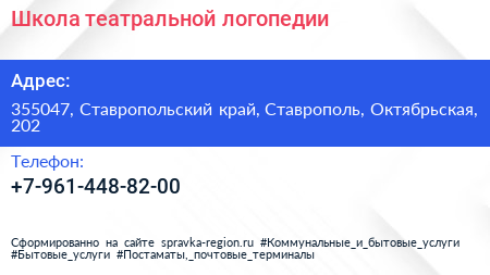Школа театральной логопедии по адресу 355047, Ставропольский край, Ставрополь, Октябрьская, 202 в дальнейшем Организация, размещена в следующих категориях: