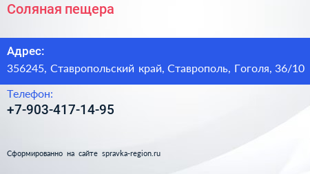 Соляная пещера по адресу 356245, Ставропольский край, Ставрополь, Гоголя, 36/10 в дальнейшем Организация, размещена в следующих категориях: