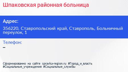 Шпаковская районная больница по адресу 356220, Ставропольский край, Ставрополь, Больничный переулок, 1 в дальнейшем Организация, размещена в следующих категориях: