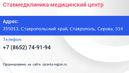 Ставмедклиника, медицинский центр по адресу 355013, Ставропольский край, Ставрополь, Серова, 514 в дальнейшем Организация, размещена в следующих категориях: