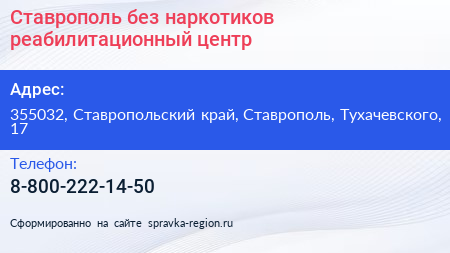 Ставрополь без наркотиков, реабилитационный центр по адресу 355032, Ставропольский край, Ставрополь, Тухачевского, 17 в дальнейшем Организация, размещена в следующих категориях: