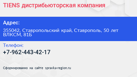 TIENS, дистрибьюторская компания по адресу 355042, Ставропольский край, Ставрополь, 50 лет ВЛКСМ, 81Б в дальнейшем Организация, размещена в следующих категориях:
