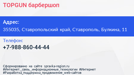 TOPGUN, барбершоп по адресу 355035, Ставропольский край, Ставрополь, Булкина, 11 в дальнейшем Организация, размещена в следующих категориях:
