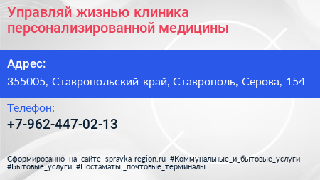 Управляй жизнью, клиника персонализированной медицины по адресу 355005, Ставропольский край, Ставрополь, Серова, 154 в дальнейшем Организация, размещена в следующих категориях: