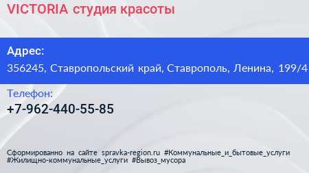 VICTORIA, студия красоты по адресу 356245, Ставропольский край, Ставрополь, Ленина, 199/4 в дальнейшем Организация, размещена в следующих категориях: