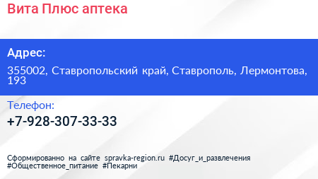 Вита Плюс, аптека по адресу 355002, Ставропольский край, Ставрополь, Лермонтова, 193 в дальнейшем Организация, размещена в следующих категориях:
