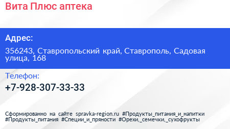 Вита Плюс, аптека по адресу 356243, Ставропольский край, Ставрополь, Садовая улица, 168 в дальнейшем Организация, размещена в следующих категориях: