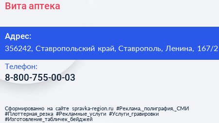Вита, аптека по адресу 356242, Ставропольский край, Ставрополь, Ленина, 167/2 в дальнейшем Организация, размещена в следующих категориях: