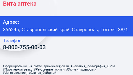 Вита, аптека по адресу 356245, Ставропольский край, Ставрополь, Гоголя, 38/1 в дальнейшем Организация, размещена в следующих категориях: