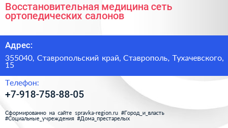 Восстановительная медицина, сеть ортопедических салонов по адресу 355040, Ставропольский край, Ставрополь, Тухачевского, 15 в дальнейшем Организация, размещена в следующих категориях: